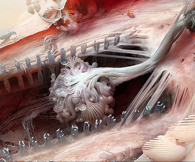 This is the latest visualization of the Enclave that is located deep in the supernatural alien desert environment. The semi-living “creature” is the result of the complex metamorphotic cycle and serves as a living shelter for its inhabitants.