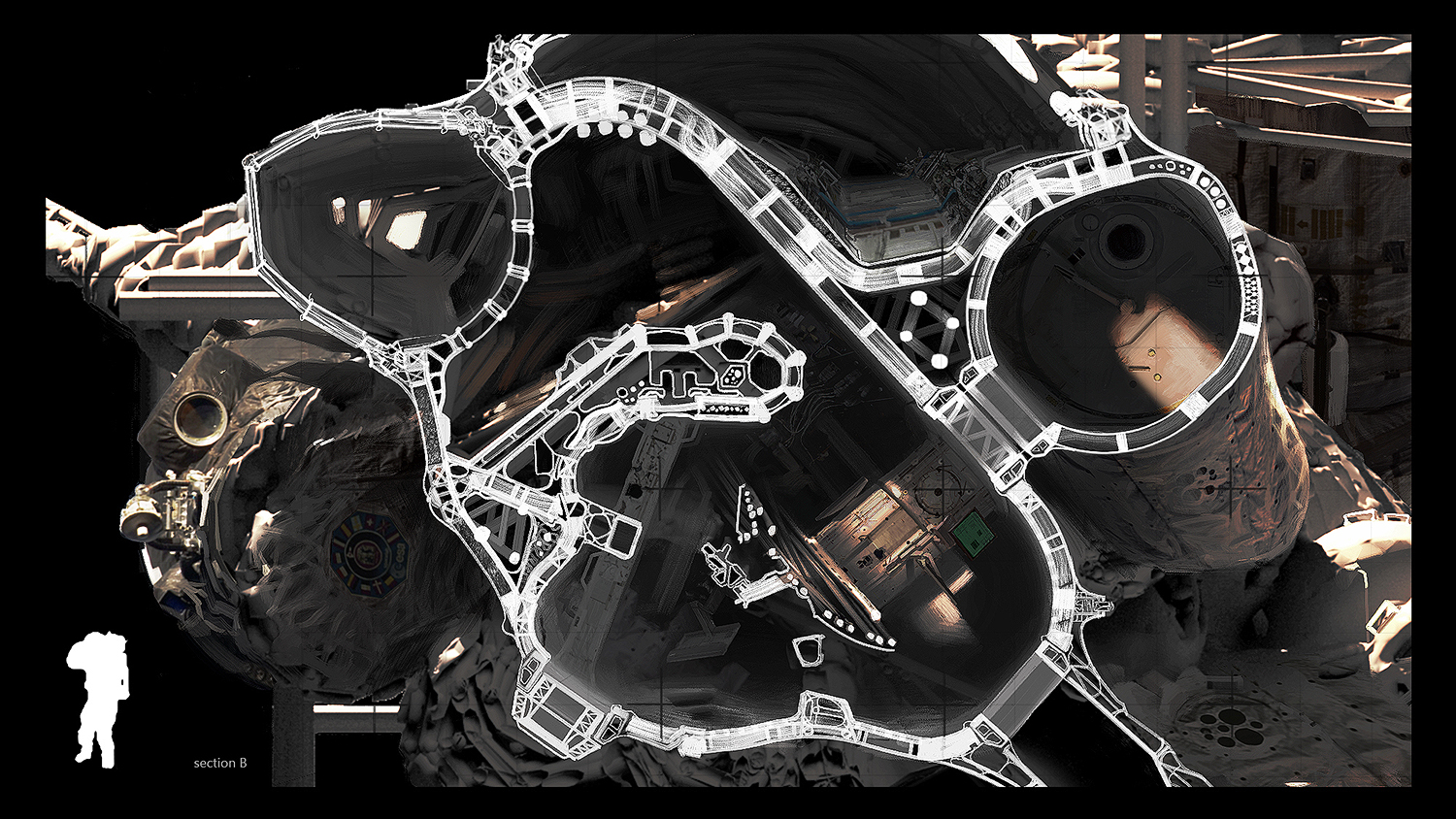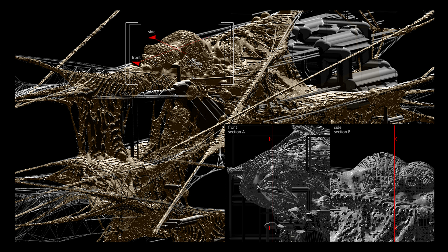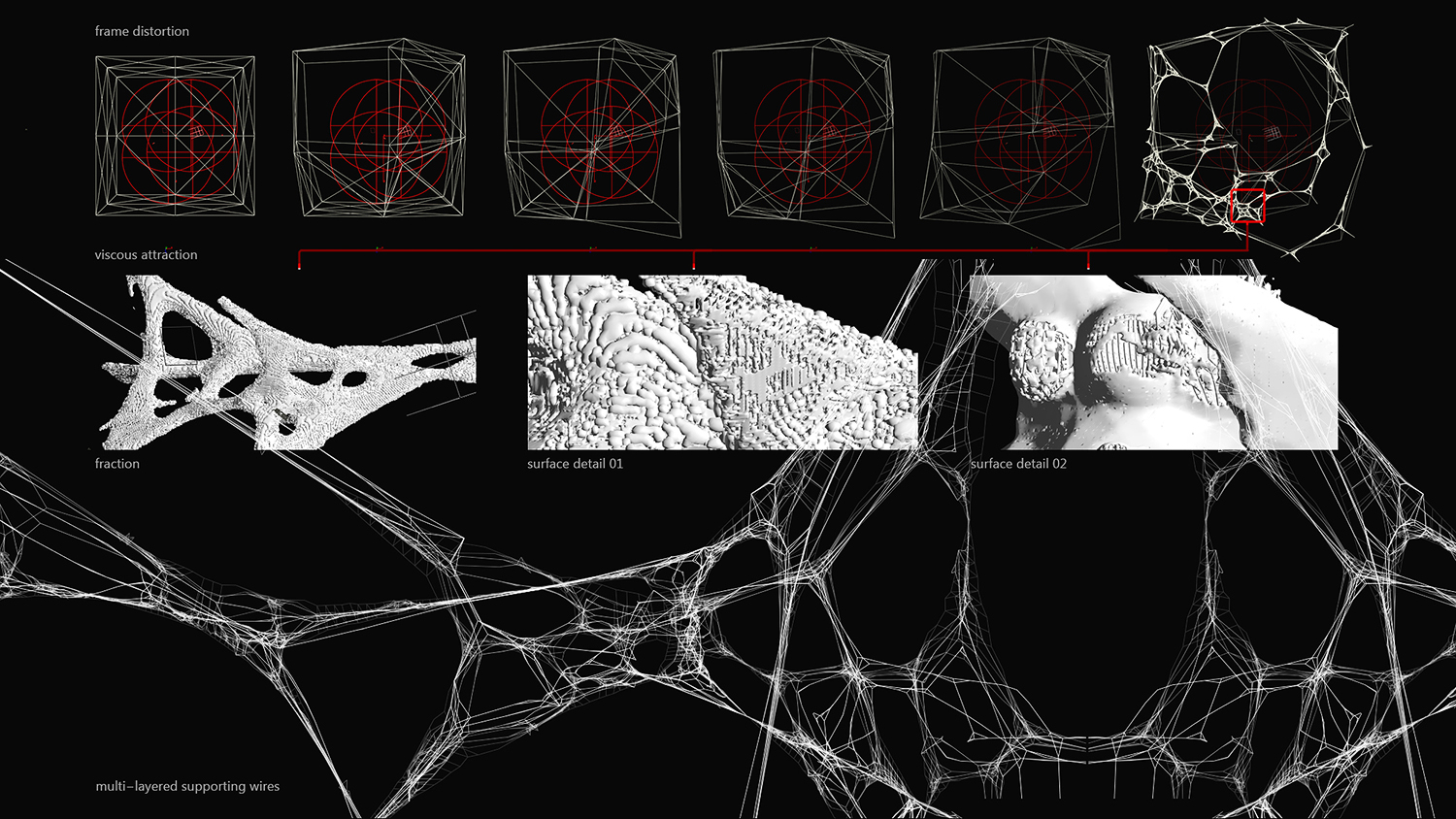 What we are looking at, is a mixture of these processes, blending together different approaches. Some of them engage reference points which disturb new or alter existing geometry attributes. The result has some architectural properties such as volumes and surface diversity. I was able to work with it later on (for example the space station section image where you can see splitting, inflating or surface blistering)