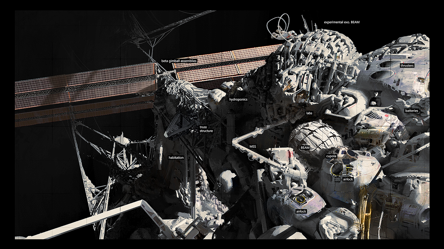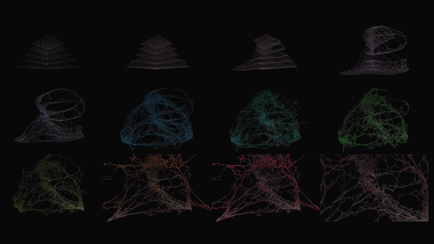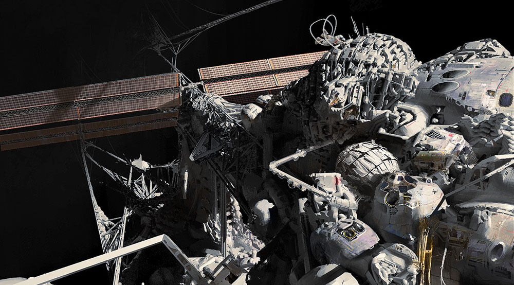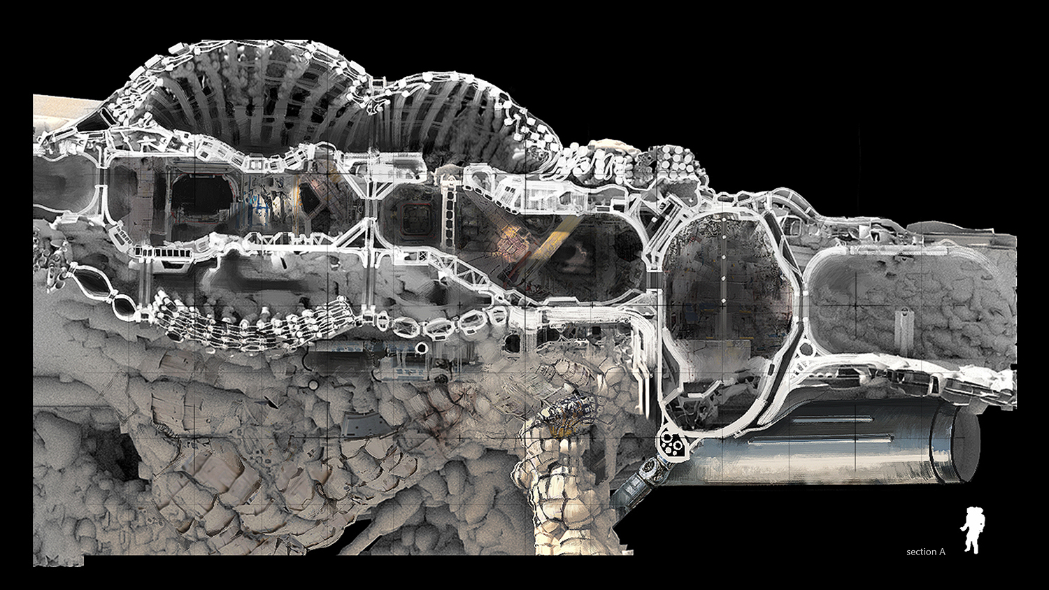 What we are looking at, is a mixture of these processes, blending together different approaches. Some of them engage reference points which disturb new or alter existing geometry attributes. The result has some architectural properties such as volumes and surface diversity. I was able to work with it later on (for example the space station section image where you can see splitting, inflating or surface blistering)